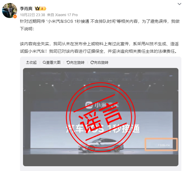 近日,网传 “小米汽车SOS 1秒接通 不含排队时间”等相关内容,10月22日,小米汽车副总裁李肖爽发文称,该内容完全失实。