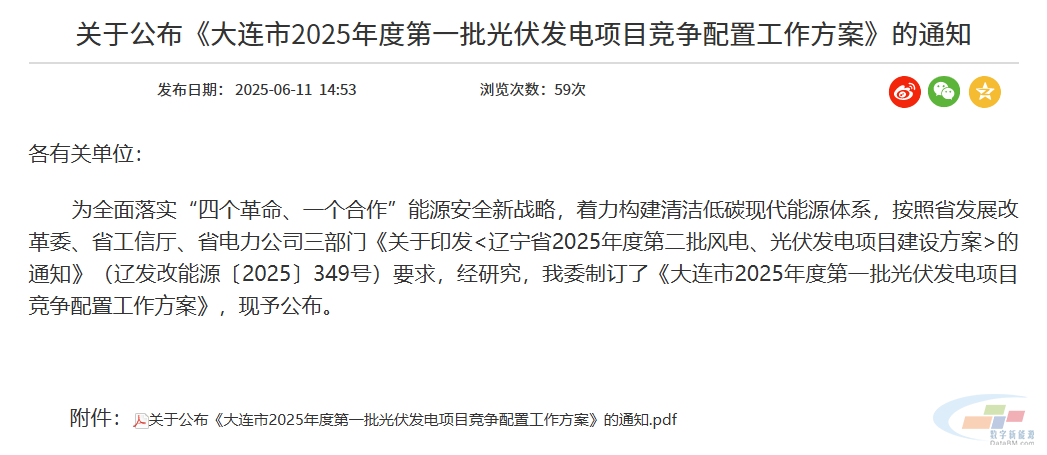 6月11日,辽宁省大连市发展和改革委员会发布关于公布《大连市2025年度第一批光伏发电项目竞争配置工作方案》的通知。